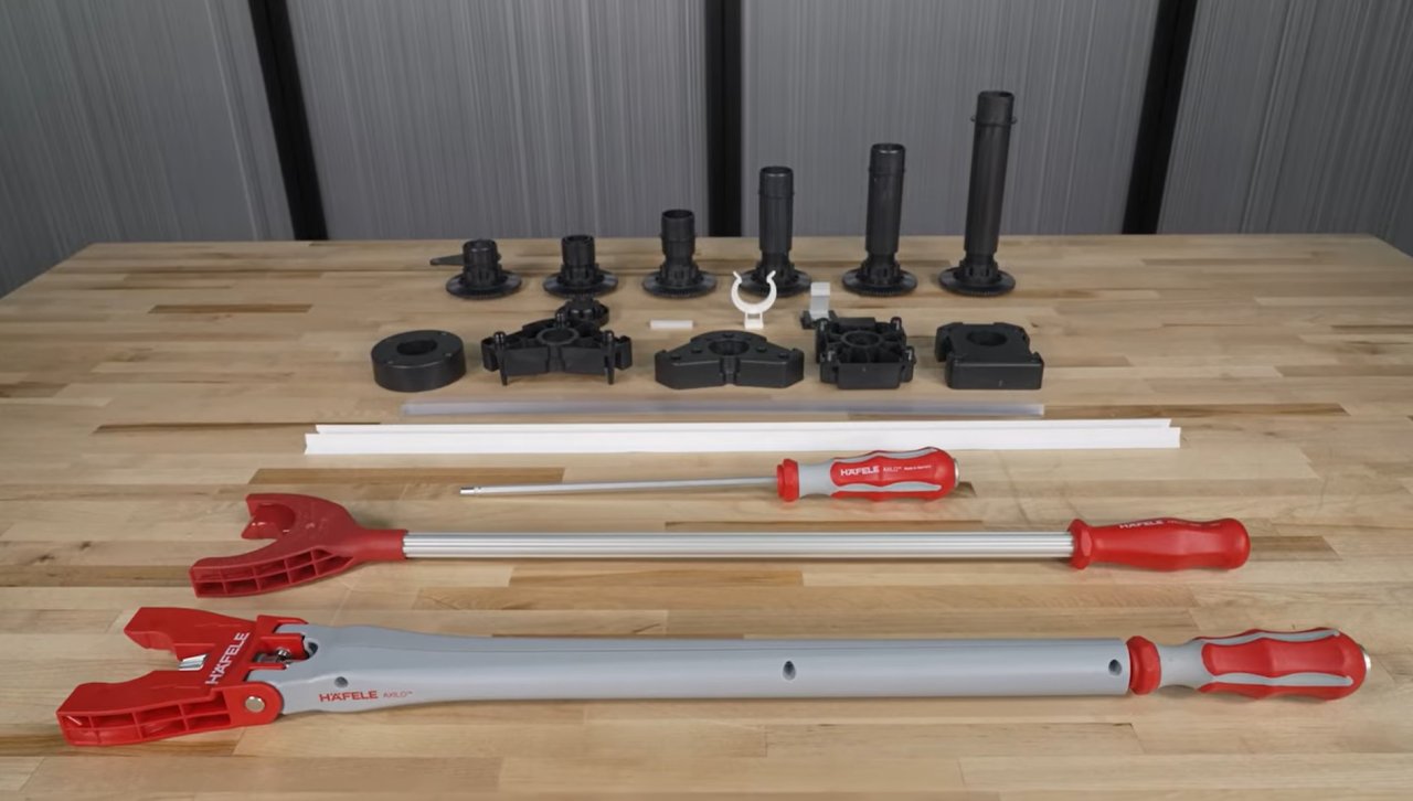 Dolap ve mobilya montajında baza ayağı yükseklik ayarını kolaylaştıran, eğilmeye gerek kalmadan ergonomik ve hızlı seviyeleme imkânı sunan patentli bir Häfele sistemidir.