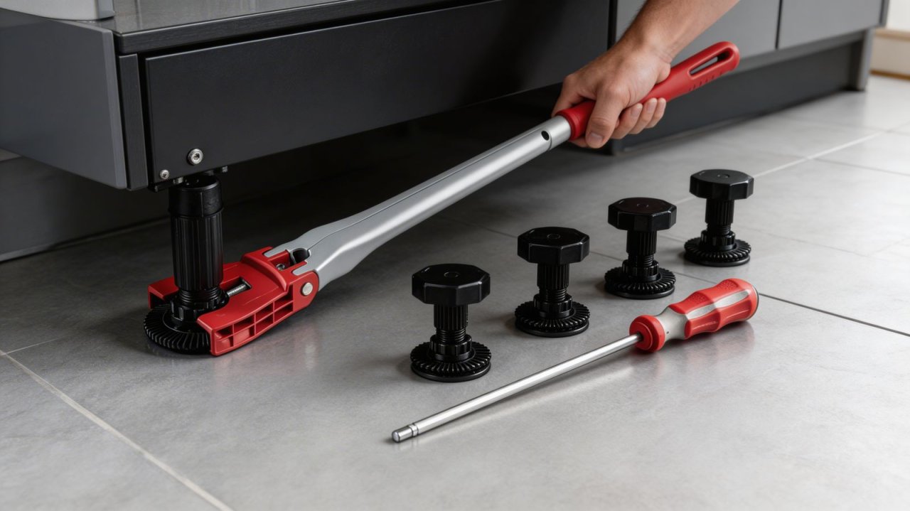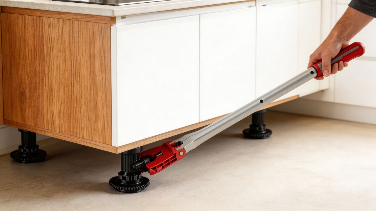 Geleneksel dolap montajında baza ayağı kabinin tam altına yerleştirilir. Özellikle köşe dolaplarında ve derin baza bölgelerinde arka ayaklara ulaşmak için neredeyse zemine uzanmak gerekir; aynı anda hem ayağı döndürmek hem de su terazisini takip etmek ise tek başına çalışan bir montajcı için oldukça güçtür. Her milimetrelik hata tüm dolap sırasının hizasını bozabileceğinden bu adım hem zaman hem de enerji açısından maliyetlidir.