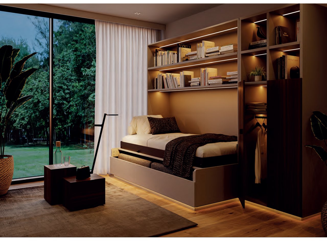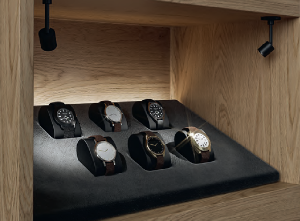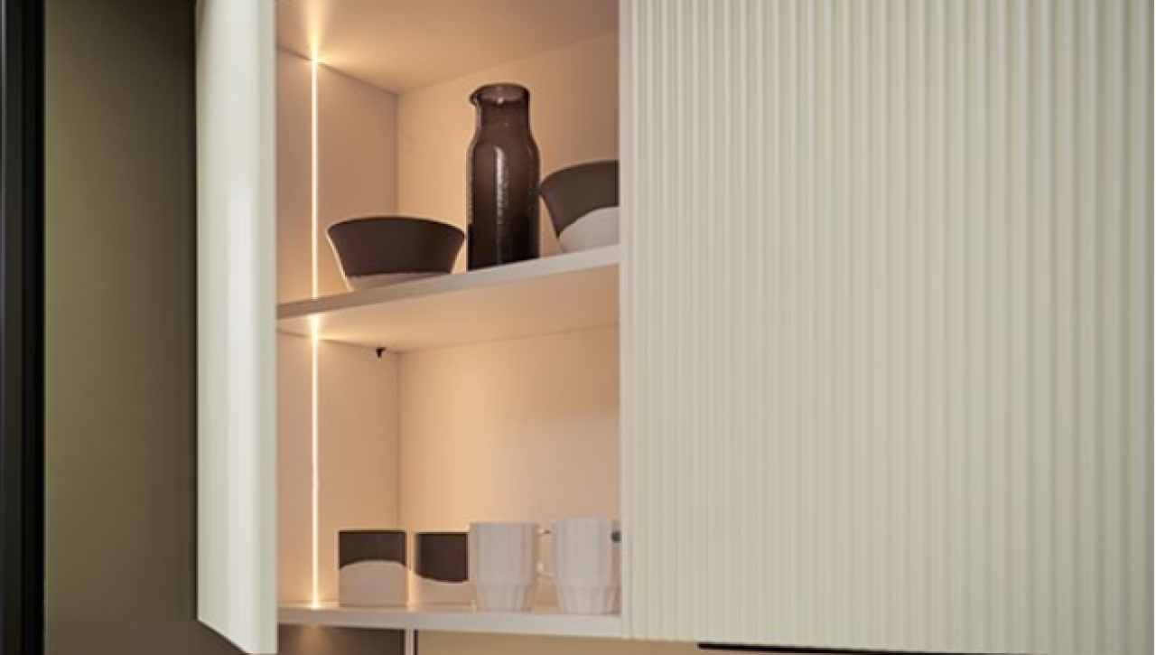 Dolap içi aydınlatmalar ve raf altı çözümleri ile etkisini hissettirir.