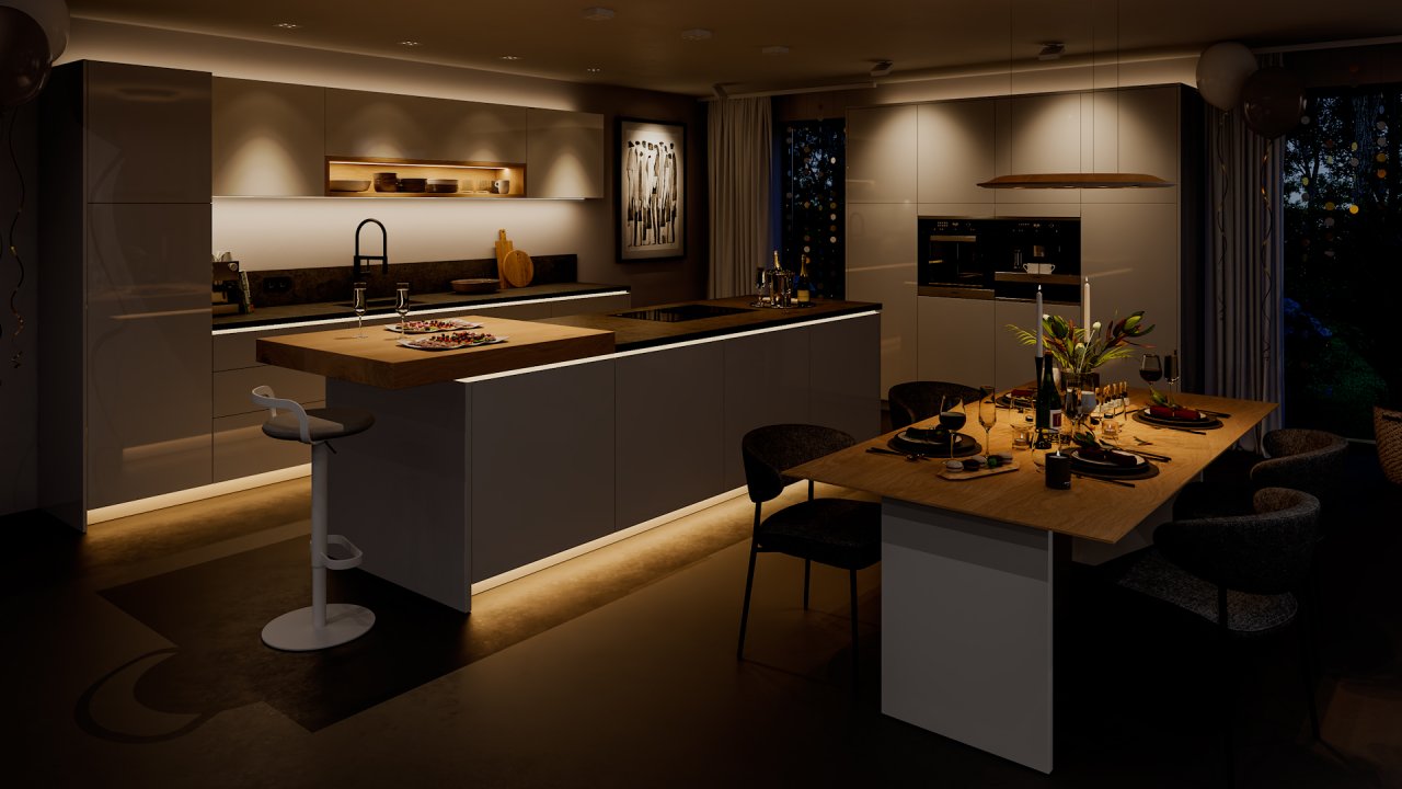 Häfele’nin akıllı aydınlatma çözümleriyle: hazırlık ya da sofra modu, hatta sohbet modu… Tek bir dokunuşla değişir.