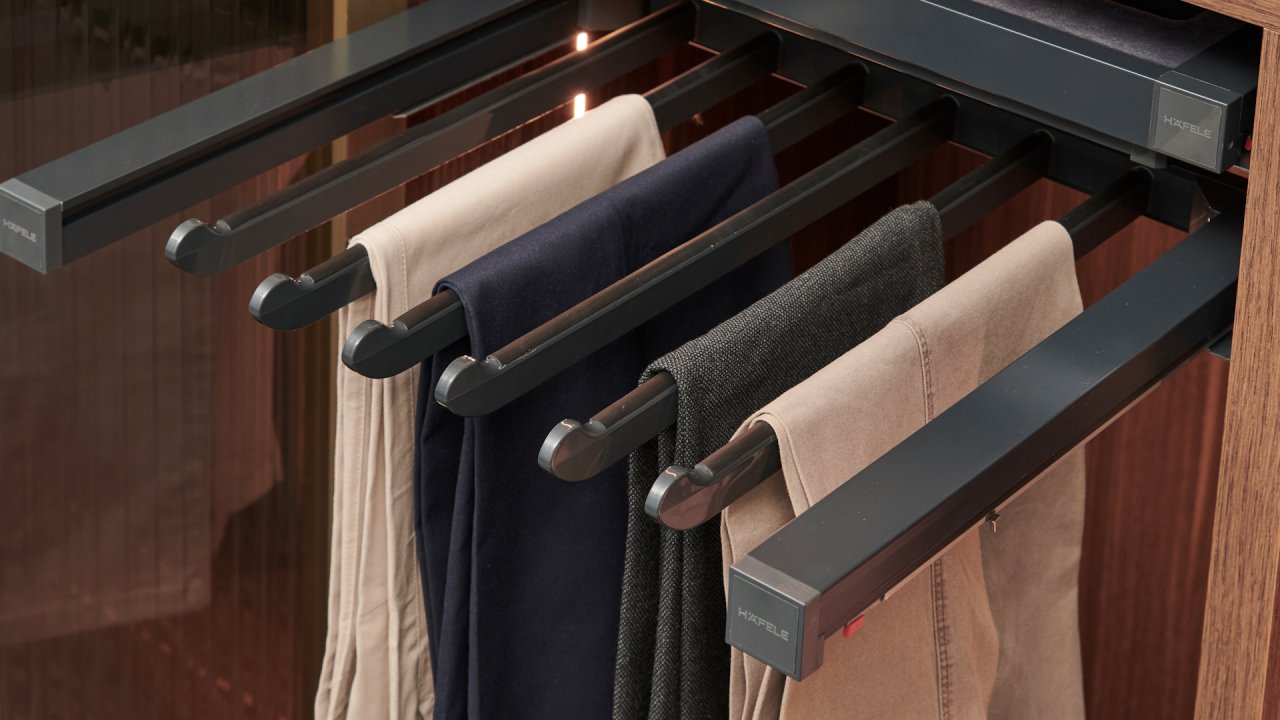 DRESS LINE Gardırop Asansörü, dolabınızın üst bölmelerindeki giysilere tabure kullanmak zorunda kalmadan rahatça ulaşmanızı sağlar. Ayrıca, DRESS LINE Çekilebilir Elbise Askı Rayı gardırop içindeki dar alanlar için işlevsel ve şık bir çözümdür.