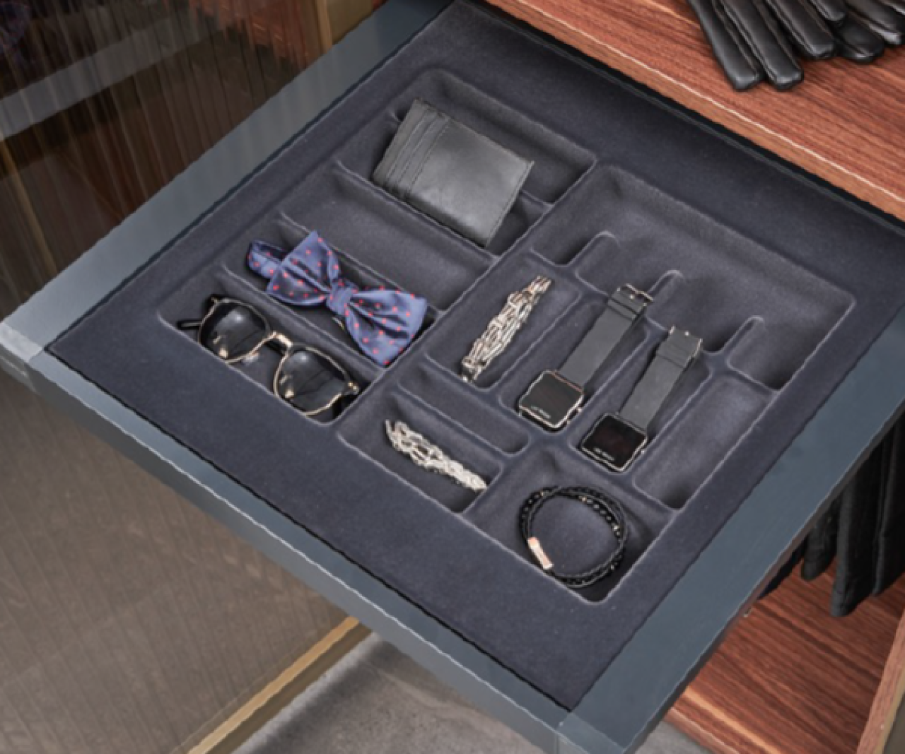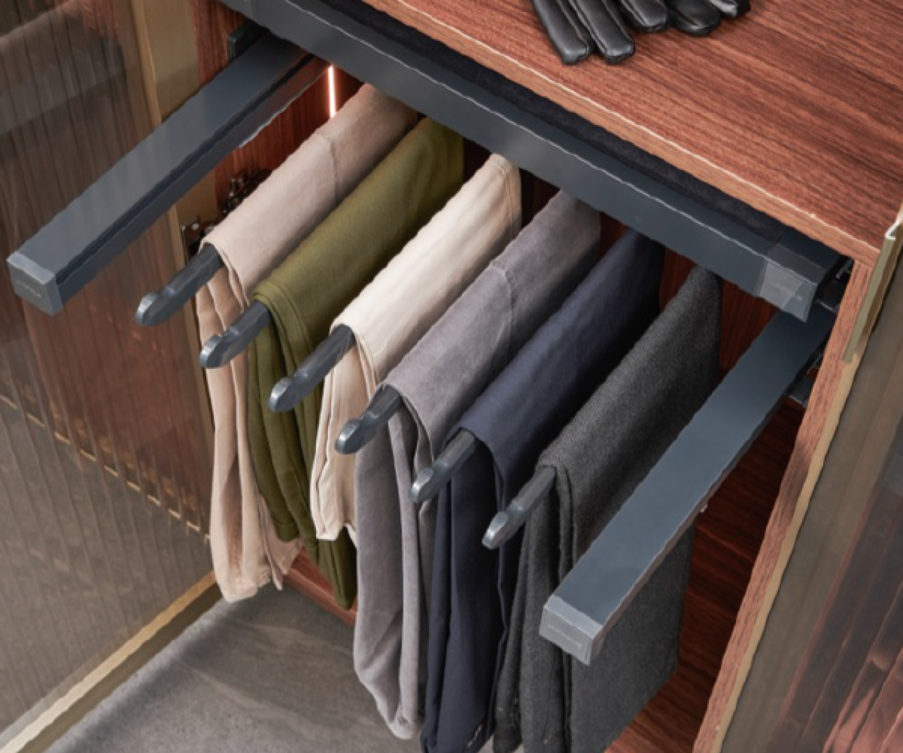 Häfele olarak sizin için geliştirdiğimiz kravatlık, pantolonluk, kemerlik ve çantalık gibi çözümler giyinme alanınızda dilediğiniz düzeni tesis edebilmeniz için ideal. Bölmeli çekmeceler ile aksesuarlıkları da aynı şekilde takı, saat ya da çoraplarınızı düzenli bir şekilde saklamak için değerlendirebilirsiniz. Çekilebilir ütü masası da kullanılmadığı durumlarda alan işgal etmeyeceği alanın optimum kullanılabileceği bir düzenin anahtarlarından.