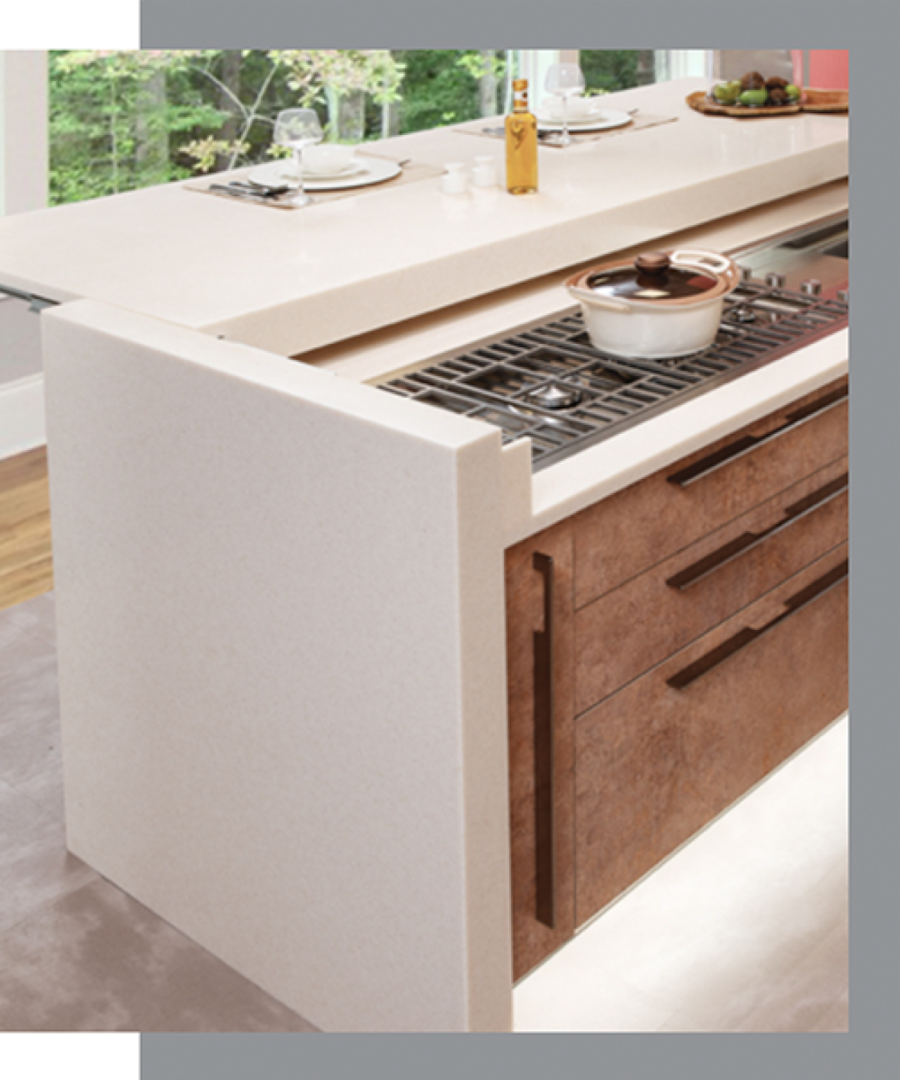 Kayar katlanır kapak sistemlerimiz misafirleriniz geldiğinde açık mutfağınızı hızla ve estetik bir şekilde saklamanızı sağlayan benzersiz bir çözüm.