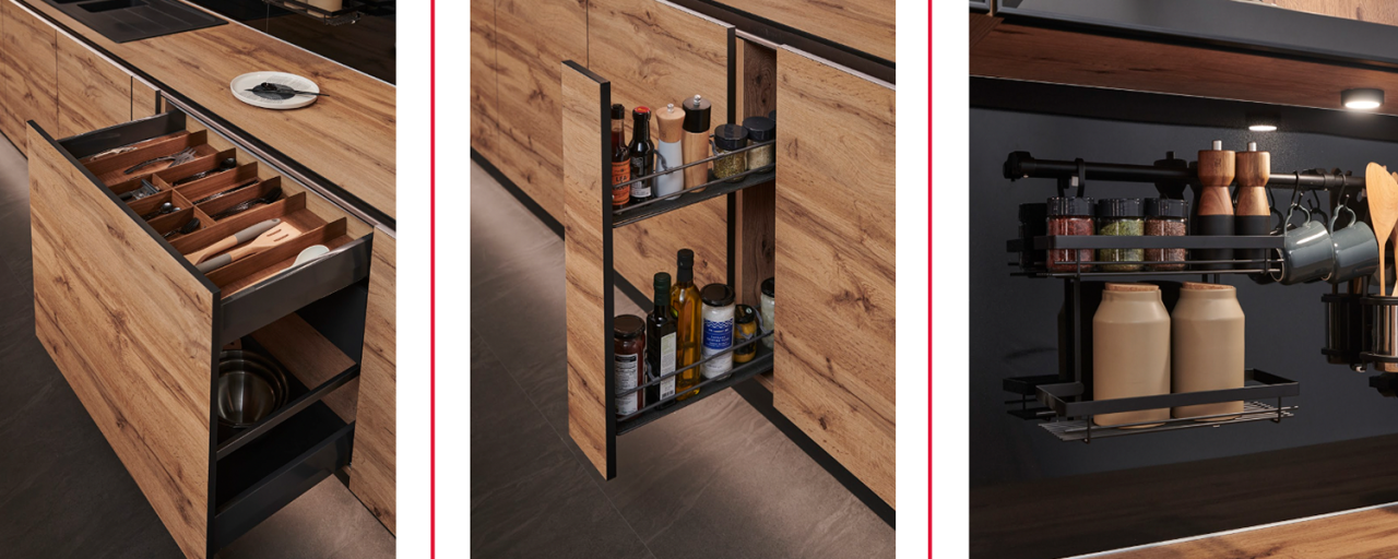 Koleksiyonlarımızın gizli kahramanları olan boy, köşe ya da tezgâh altı kiler ve çekmece içi organizasyon sistemleri, şişelik, tepsilik, çatal kaşıklık ve kapak düzenekleri de kullanım sırasında yine aynı form ahengiyle sahneye çıkarlar.