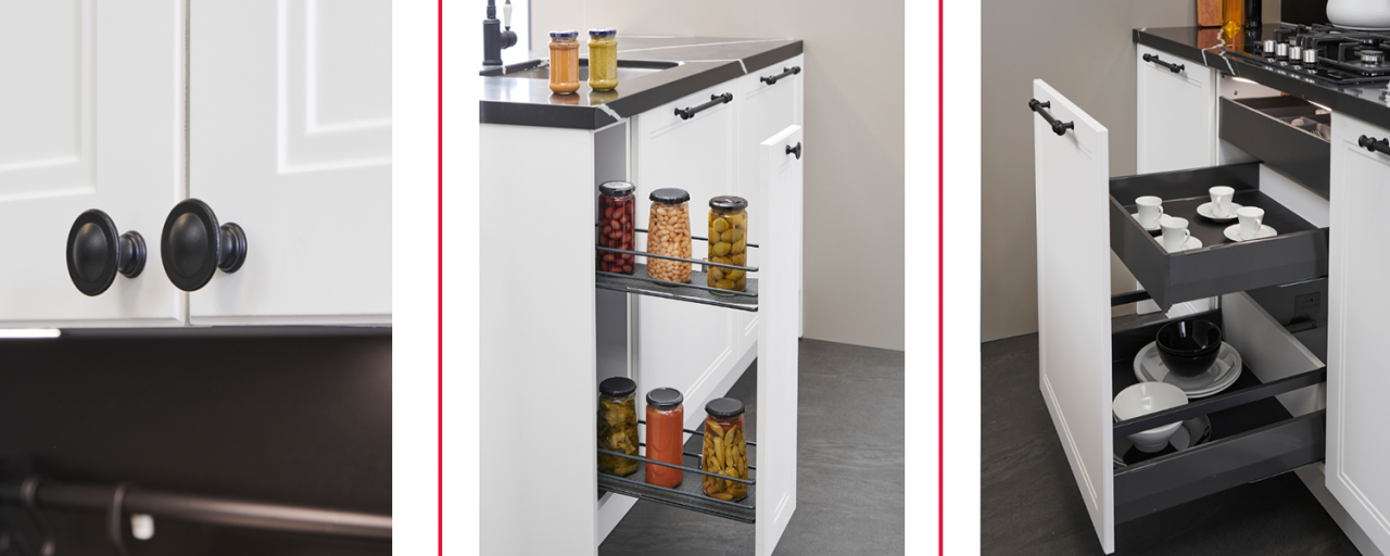 Koleksiyonlarımızın gizli kahramanları olan boy, köşe ya da tezgâh altı kiler ve çekmece içi organizasyon sistemleri, şişelik, tepsilik, çatal kaşıklık ve kapak düzenekleri de kullanım sırasında yine aynı form ahengiyle sahneye çıkarlar.
