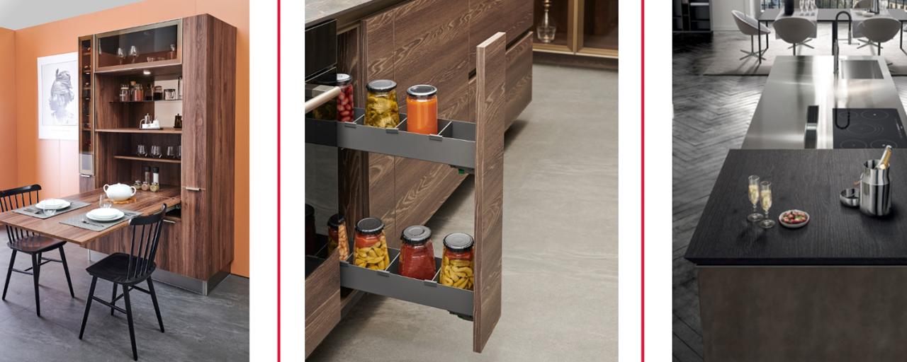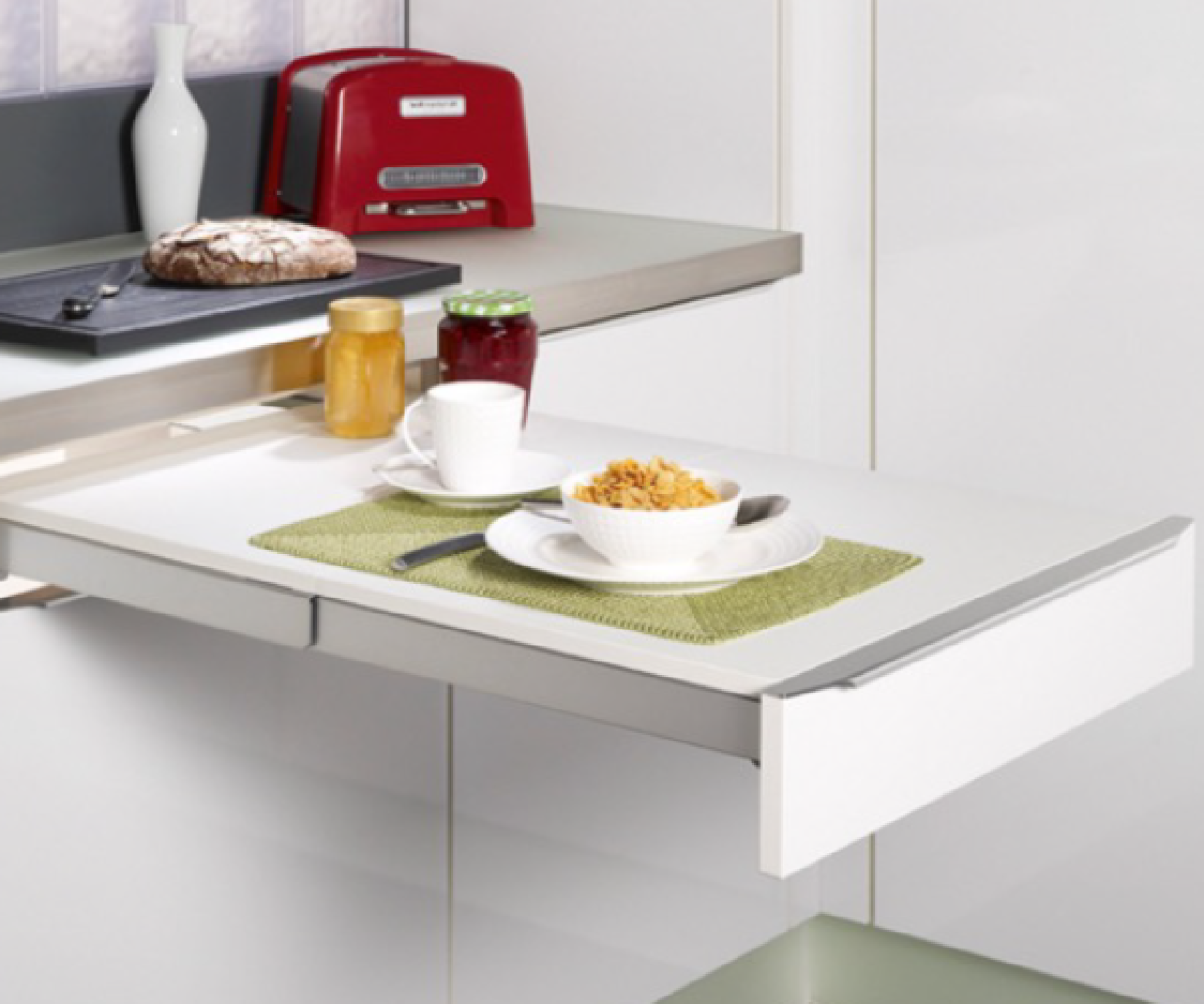 Häfele’nin tezgâha ya da çekmecelere entegre açılabilir masa donanımları, yemek yaparken tüm ihtiyaçlarınızın elinizin altında olmasını sağlayan aşçı yamağı sistemi ve diğer tüm pratik çözümleri mutfağınızdaki zamana karşı yarışları kazanmanızı sağlayacak.